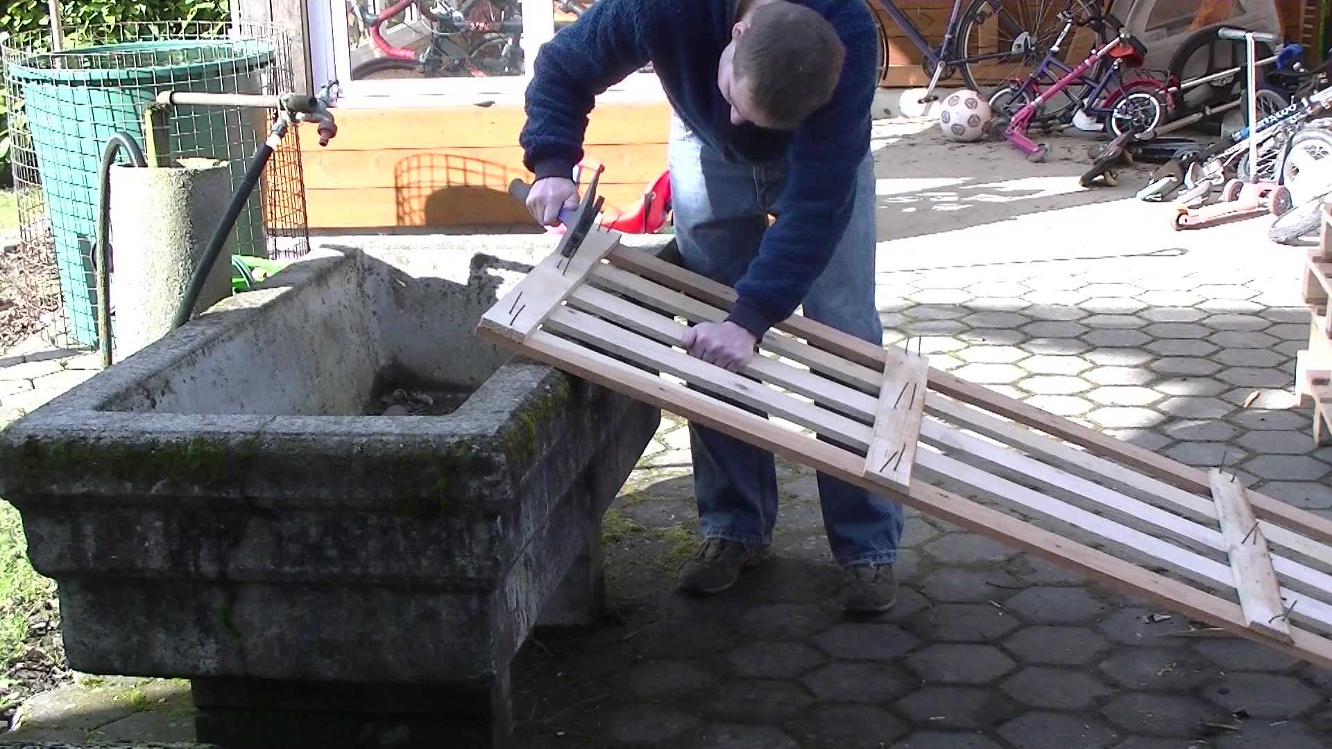 - К свободным краям поддонов прикрутить рейки, в пазы которых вставить доски. Мобильность полученной стенки позволит без труда доставать готовый продукт.
