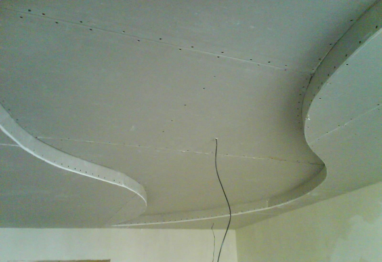 Гипсокартон. Этот материал удобен тем, что под ним можно спрятать электропроводку и скрыть неровности потолка. К недостаткам можно отнести тот факт, что листы гипсокартона уменьшат высоту потолков.