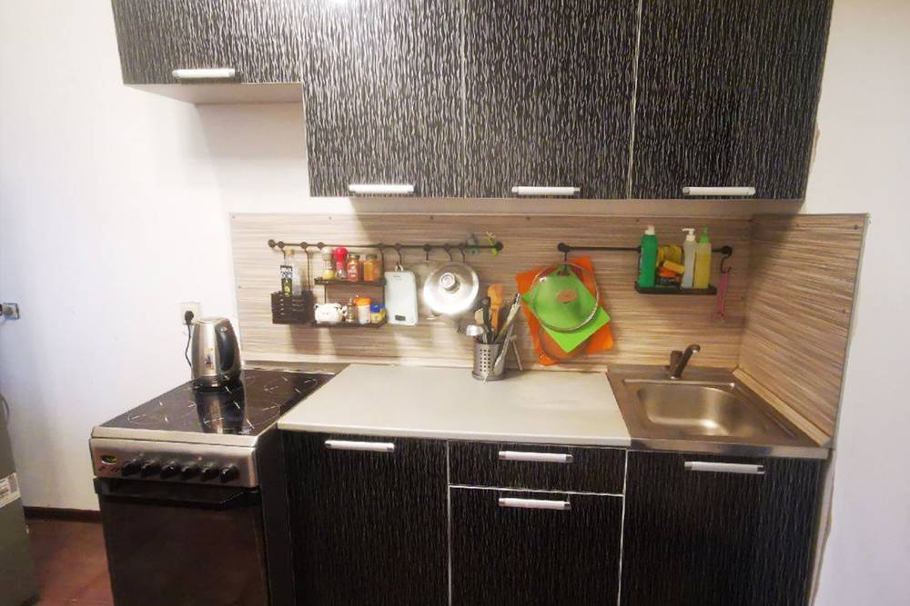 А так выглядела кухня до ремонта. Гарнитур совсем небольшой, поэтому места для хранения мне не хватало