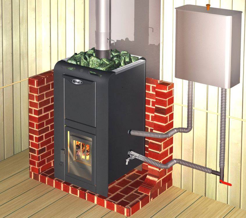 Оборудование для подогрева воды может быть встроенным, или выносным. Часто бак размещают в парилке, в предбаннике, или в обмывочной. Обкладывают камнем или кирпичом для лучшего удержания тепла. В первую очередь, выбор агрегата зависит от того, какой энергоноситель будет использован: электричество, газ, дрова, или специальное твердое топливо.