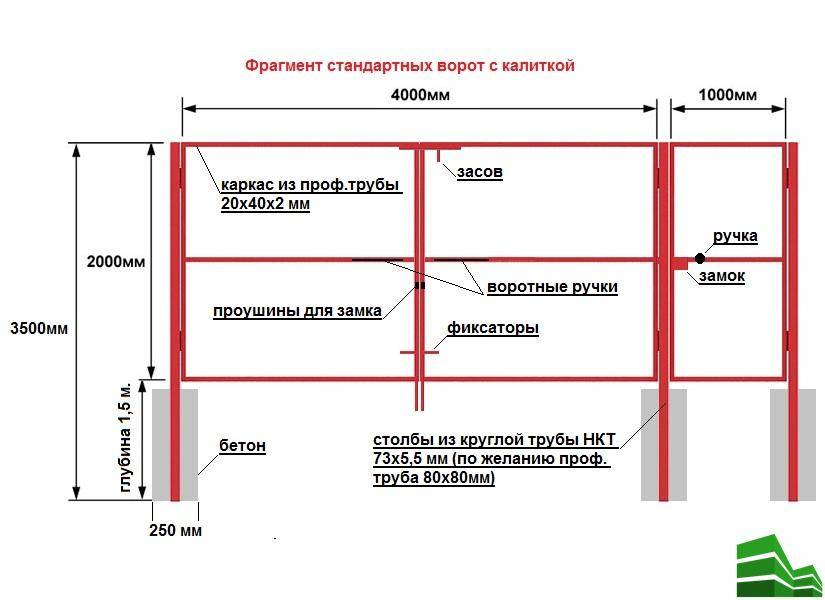 Формула, которой пользуются при выполнении расчетов, довольно проста. Потребуется замерить высоту и ширину створок в зависимости от параметров опорных столбов, учесть необходимость обеспечения зазора между нижней планкой рамы ворот и почвой: