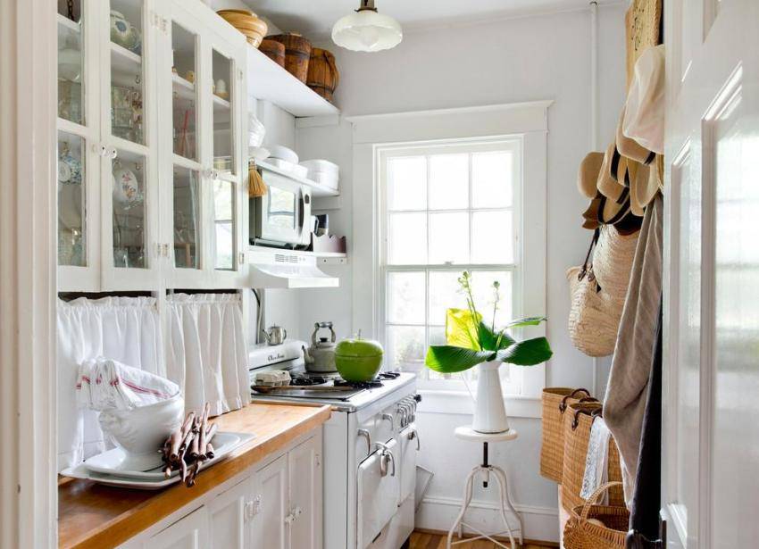 На небольших кухнях нужно максимально рационально использовать пространство. Потайные полочки и встроенные шкафы в таком случае ваши лучшие друзья.
