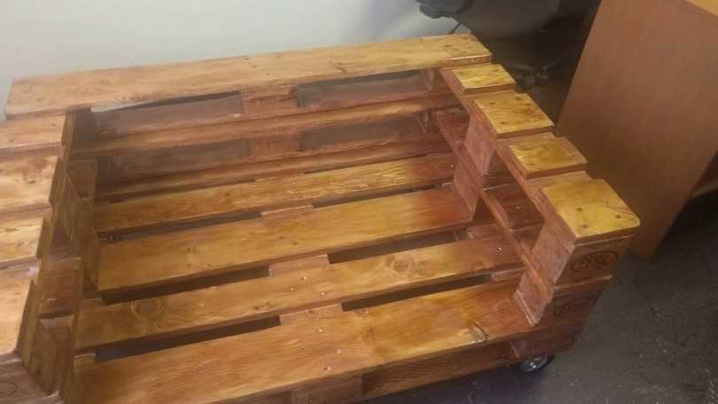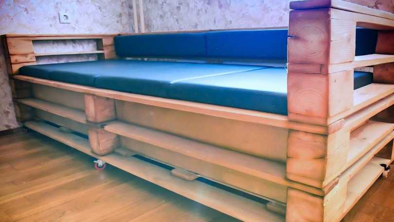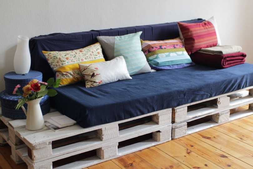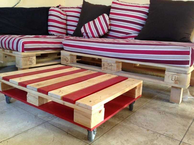 Из паллет, как из конструктора, собираются угловые диваны, столы, кресла. Для удобства на самодельные диваны и стулья шьются подушки из хлопкового материала, набитые поролоном или холофайбером.
