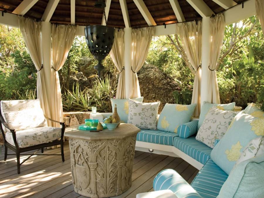 В качестве напольного покрытия чаще используют деревянную доску с влагостойкой пропиткой, кафельную плитку под натуральный камень. Барбекю (стационарное, переносное) устанавливают на таком расстоянии, чтобы жар от него не распространялся на зону отдыха. Стационарное барбекю устанавливают в беседках больших размеров.
