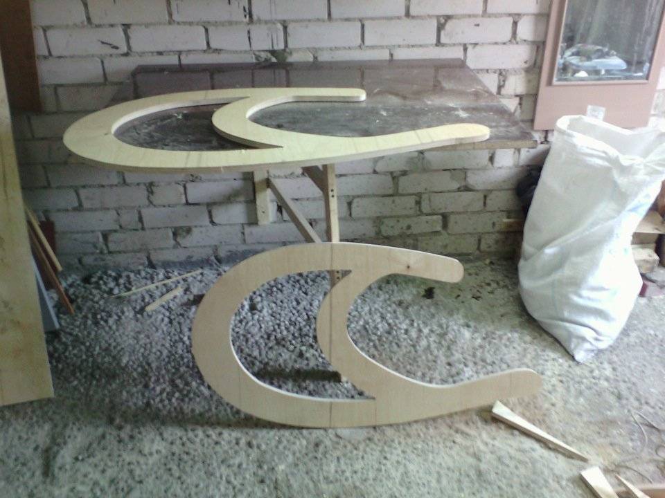 Для начала в деревянной доске размерами 4.5 на 4.5 сантиметра сделать пазы 1 метр. Концы досок обточить под место в шлицах полозьев. Доски для полозьев уложить в горячую воду, пока древесина не будет податливой для сгибания. С помощью приспособления согнуть доску на подходящий радиус и отложить в таком состоянии, пока она полностью не высохнет. Высохшие полозья поставить на ножки, заблаговременно подвергнув обработке пазы клеем.