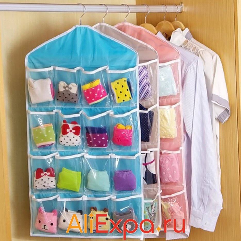 Органайзер состоит из 16 кармашиков (14.5*10.5 см), которые расположены на полиэфирной ткани. Вешалку можно повесить в шкаф для хранения одежды: трусов, носков, колгот или на стену для мелочей. Хороший помощник защитит ваши вещи от грязи, пыли и бактерий. Подвесная сумка позволяет содержать вашу спальню аккуратной и чистой. Выбирайте цвет, который симпатизирует вам больше: зелёный, синий, розовый, бежевый.