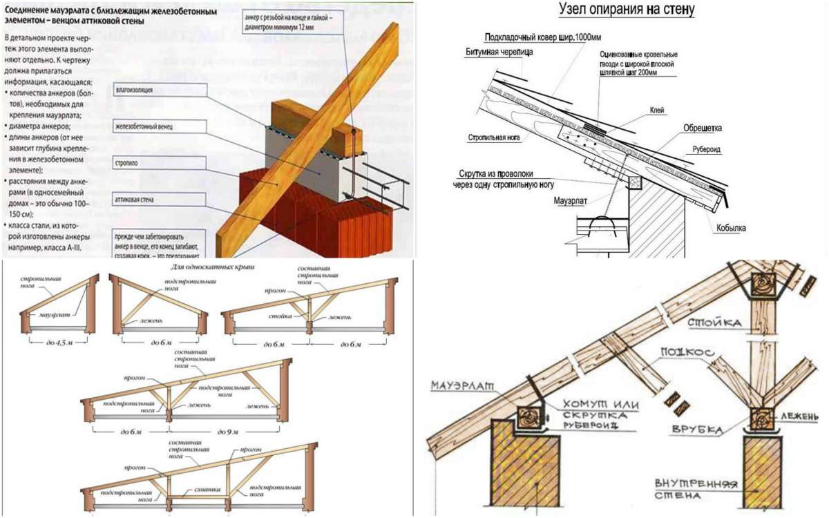 При ширине пролета от 4,5 метров до 6 метров, требуется еще лежень, закрепленный на более высокой стене на уровне перекрытия и подстропильная нога, которая упирается в балку почти в середине. Угол уклона этой балки зависит от расстояния между стенами и уровня установки лежня.