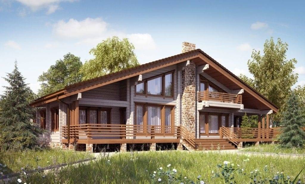 Современным строительством предполагаются дома с крышей шале, где 1-ые этажи делают из кирпича или ячеистых бетонов, второй этаж выполняется из древесины хвойных пород. Верхний этаж из дерева при подобной конструкции дома хорошо защищается от влияния влаги, которая идет от земли, благодаря чему дома долговечны.