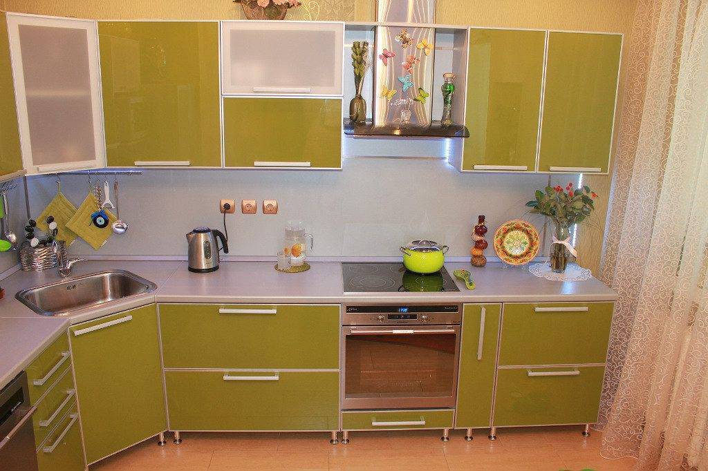 На небольшой кухне в 9 кв. м. можно положить светлый ромбовидный кафель, стены отделать белой штукатуркой, а фартук – имитацией каменной или кирпичной кладки. На таком фоне будет гармонично смотреться белоснежный гарнитур с темными столешницами и зелеными подвесными ящиками. Напротив рабочей зоны следует поставить аккуратный стеклянный стол на хромированных ножках и пару стульев на металлокаркасах с зелеными ткаными сидушками.
