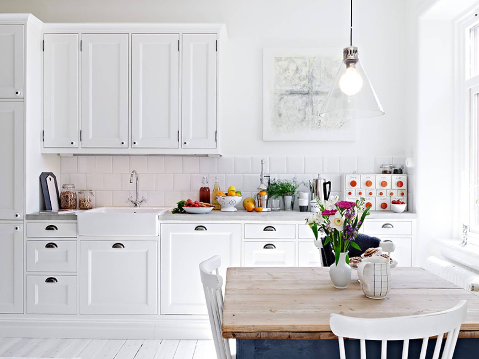 Белый цвет адаптируется к любому дизайну кухни: традиционному и современному. Поменяв ручки на шкафах, вы сможете изменить внешний вид кухни с помощью тонких деталей и избежать дорогостоящей реконструкции.