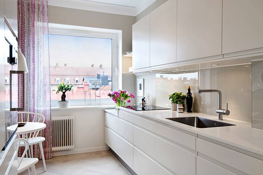 Преобладание белого в интерьере способствует формированию ощущения дополнительного пространства. Именно поэтому дизайнеры рекомендуют обустраивать белую кухню в интерьере маленькой кухни. Яркая и колоритная мебель на миниатюрной кухне, наоборот, зрительно уменьшит пространство. Кухонная мебель и отделка, в том числе столешница белого цвета, отлично впишутся в интерьер малогабаритной квартиры или дома.