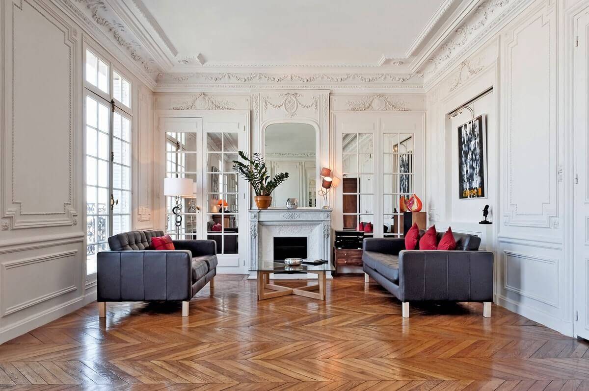 Лепниной, чаще всего белой гипсовой, иногда с позолотой, декорируют высокие белые потолки. В парижских квартирах старого фонда лепнина всегда идет в дуэте с паркетом, он может быть тёмным или светлым, матовым или глянцевым, главное, чтобы был выложен «ёлочкой». Фактура паркета визуально согревает интерьер, уравновешивая «прохладный» эффект минималистичных светлых стен — ещё одной составляющей парижского стиля в интерьере.