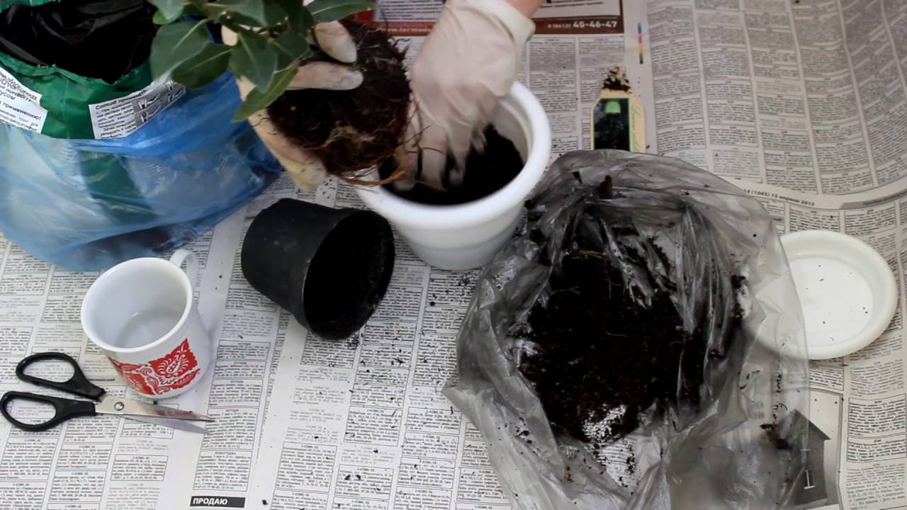 Все составляющие тщательно перемещать; на дно горшка положить слой дренажа из керамзита или крупного пенопласта; саженец тщательно полить и осторожно достать из грунта; пересадить в новый горшок, добавить грунт и утрамбовать. Немного полить теплой водой