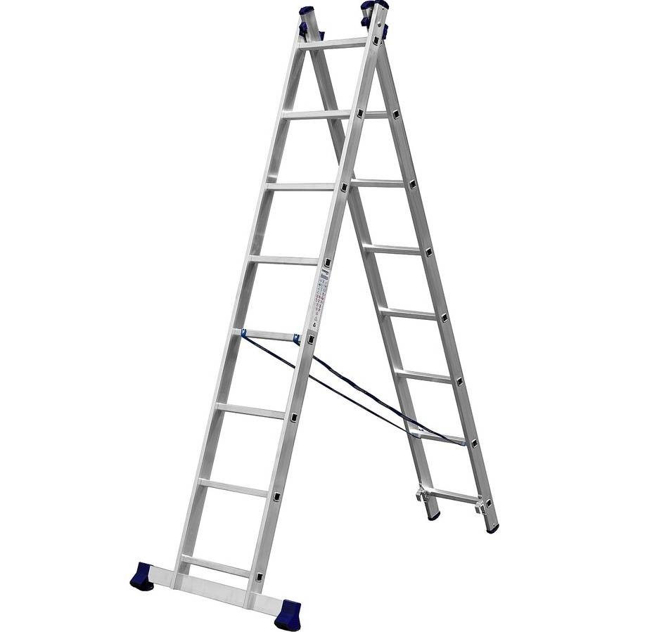 На первое место рейтинга в категории шарнирных лестниц попала отечественная модель с двумя секциями по 2.59 м каждая. По сторонам имеется 9 ступеней с рельефной поверхностью, предотвращающей соскальзывание подошвы пользователя. Шарнир выполнен таким образом, что разворачивает каркас на 180 градусов, но не проходит дальше, поэтому конструкция стабильна для использования в качестве приставной лестницы. Чтобы оператор не раскачивался, производитель предусмотрел траверсу, длиной 800 мм, которая закрепляется на двух стойках болтами. Она предотвращает боковое падение и увеличивает опорную площадь. Изделие сконструировано полностью из алюминия, поэтому не ржавеет и не нуждается в покраске.