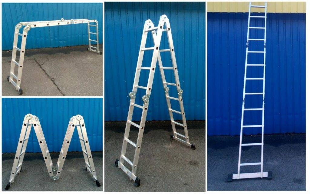 Наиболее универсальной можно назвать шарнирную лестницу-трансформер. Она состоит из нескольких секций, соединенных шарнирами. Трансформер 4×4 может выступать во всех вышеперечисленных конфигурациях, а также принимать вид лестницы с консолью. Чтобы шарнирная лестница была надежно зафиксирована в разложенном состоянии, монтируют крючки.