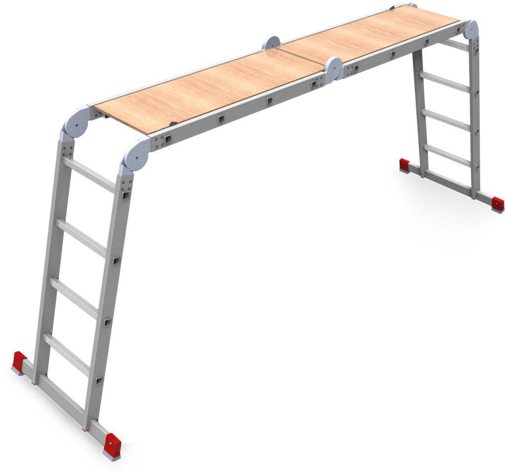 Можно выделить и подмостку. Это четырехсекционная система, раскладывающаяся так, что ее крайние секции становятся под прямым углом. Таким образом конструкция превращается в подмостку, очень удобна для отделки на небольшой высоте.