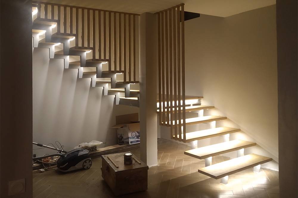 Готовая лестница с реечным ограждением и подсветкой. Перил не делали — необходимости в них нет. Но если понадобятся, их можно пустить вдоль стены
