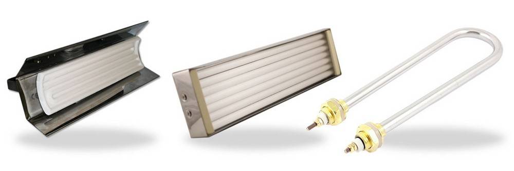 Элемент нагрева в оболочке из керамики не излучает яркий свет. Срок его службы составляет три года. Он стоит дороже, чем кварцевый, но электроэнергии берёт меньше. Керамика медленно разогревается и остывает, но безопасна экономична. Её часто применяют в больницах, поликлиниках, банях и саунах.