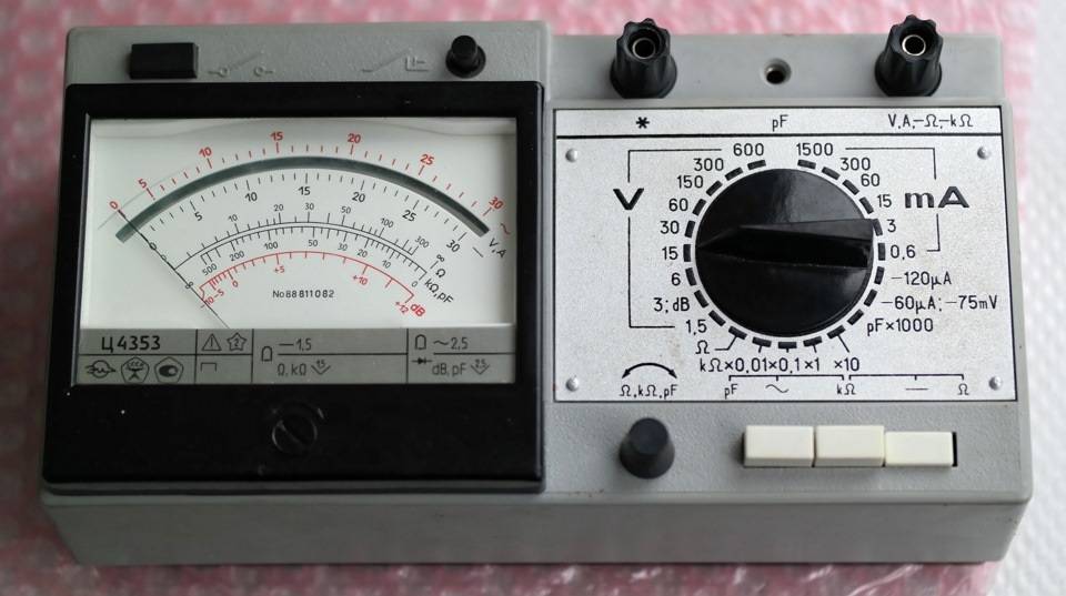 Устройство с измерительной шкалой и показывающей стрелкой. Принцип действия достаточно прост. Измерительная головка инструмента состоит из катушки, внутри которой установлена вращающаяся рамка, механически связанная с пружиной и стрелкой. Ток, проходя по виткам катушки, генерирует в ней магнитное поле.