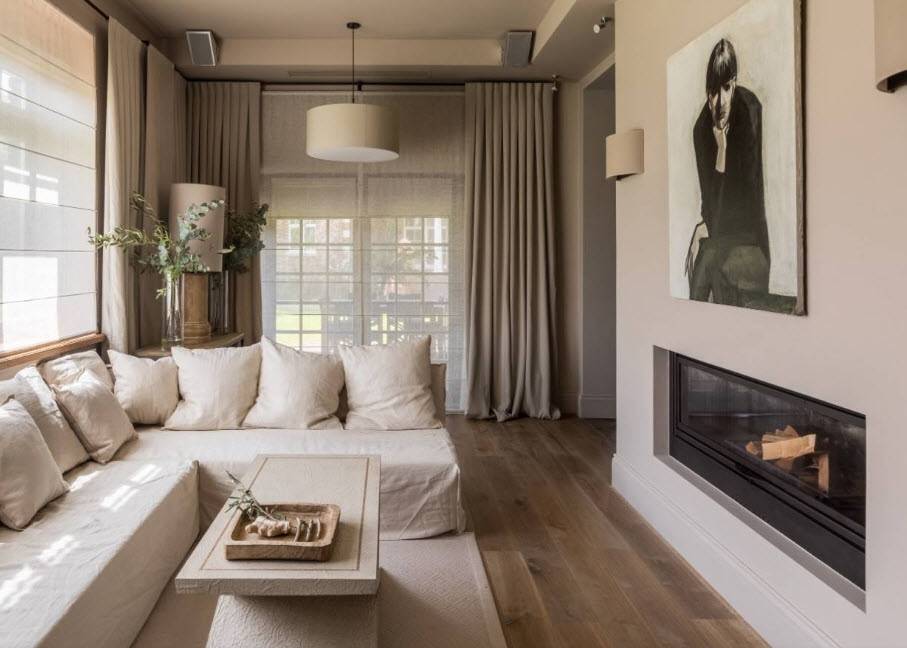 Труднее всего оформить маленькую или узкую гостиную с двумя окнами. Здесь полно ограничений, в первую очередь касающихся выбора стиля для оформления пространства. Дизайнеры рекомендуют выбирать между модерном и минимализмом, ведь только эти стили предполагают полное отсутствие вычурных деталей и ненужных предметов. В такой гостиной может находиться лишь зона отдыха, представляющая собой диван и пару кресел с телевизором, расположенным напротив мягкого уголка.