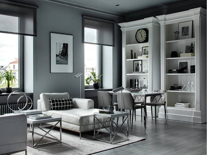 В современных залах допустимо использование темных красок. Однако обращаться к ним можно только в том случае, если в комнате присутствует много естественного и искусственного освещения.