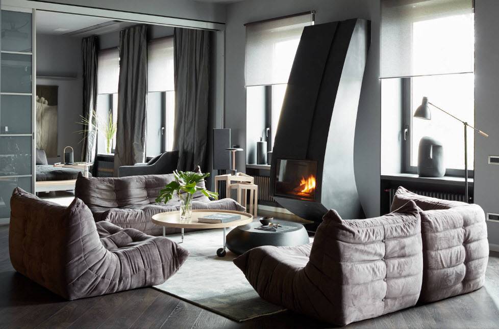 Хаотичная асимметричная планировка органично вписывается в современные интерьеры. Нестандартная расстановка делает гостиную особенной и индивидуальной. Но мебель для таких проектов лучше делать на заказ – четко под свои замеры и особенности помещения.