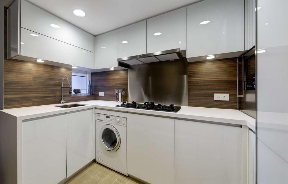 Очень популярным приемом расположения кухонной мебели является деление мебельного набора на две части. В таком случае навесные шкафы, столешница, разделочная плита, варочная плита и духовка становятся одной единой частью, а шкаф-тумба с мойкой и стиральной машиной располагаются на боковой стене и становятся другой отдельной частью. Этот способ является наиболее оптимальным, если говорить об эргономике, удобстве подключения и долговечности работы бытовой техники.