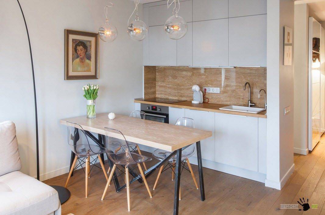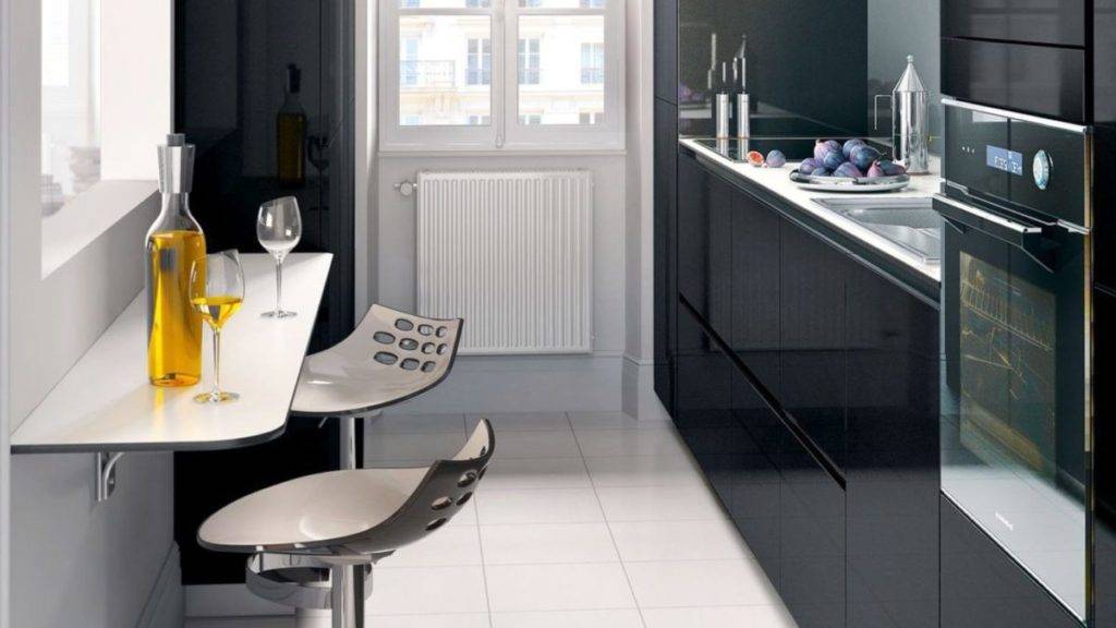 В маленькой узкой кухне проблематично найти место для обеденной зоны, так как после установки гарнитура остается узкий проход. Здесь может быть несколько вариантов, в зависимости от того, на сколько человек будет рассчитана обеденная зона: