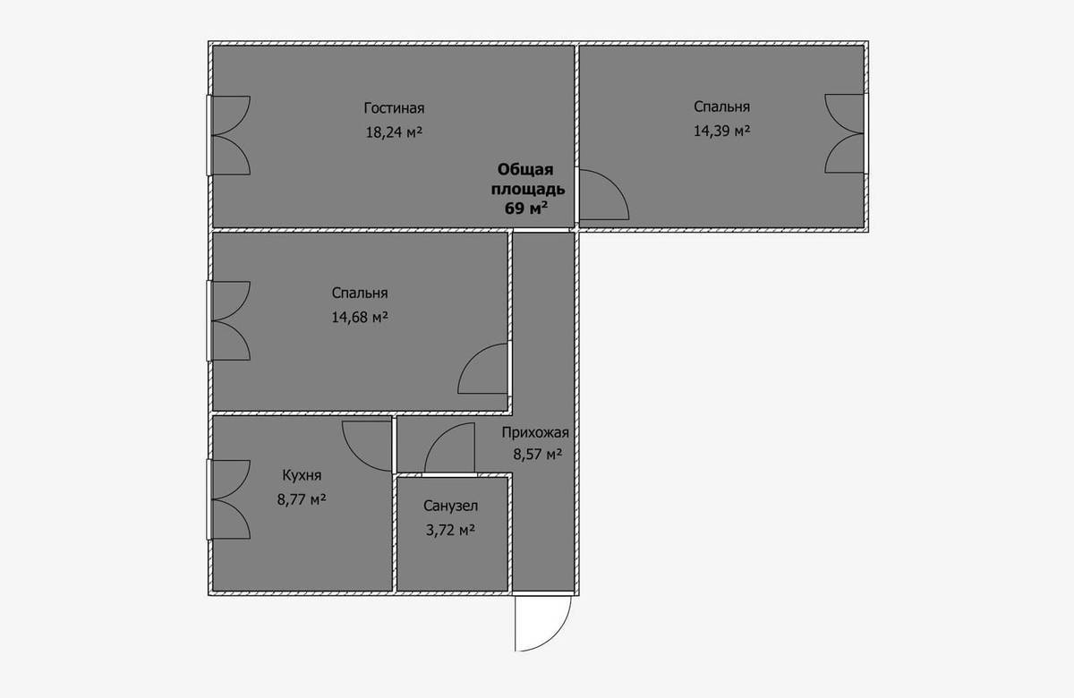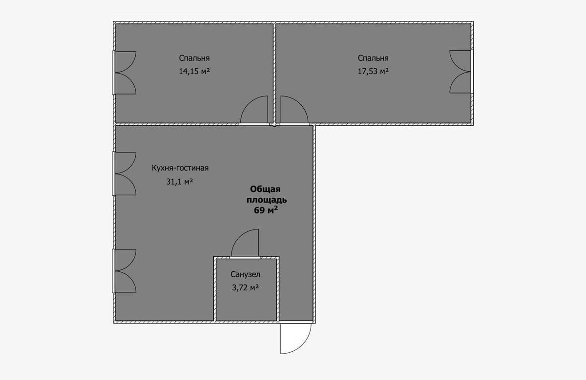 После присоединения кухни к гостиной достаточно установить двери в спальни