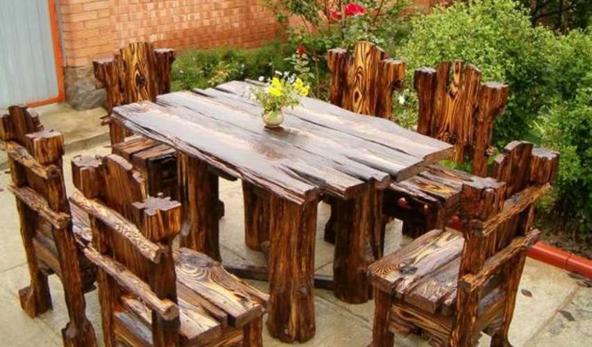 Необычный вид обожженной древесины придает мебели из массива особый шарм