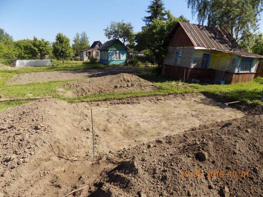 В первую очередь необходимо подготовить площадку под строительство. Для этого требуется очистить участок от всех загрязнений и мусора, а также снять плодородную часть грунта (около 15 см). После этого выполняется разметка участка по всему периметру будущего фундамента. Для этого по углам дома расставляются колышки по внешней и внутренней стороне фундамента, и натягивается бечевка. Углы необходимо проверять угольником.