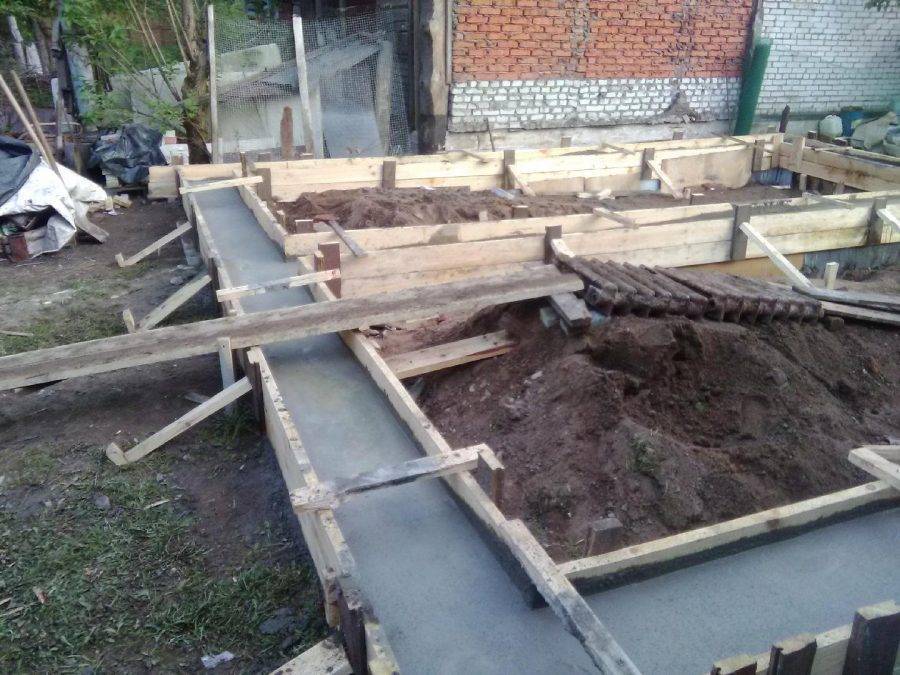 По истечении 3-х дней после заливки бетона, опалубку уже можно будет демонтировать, а стороны фундамента гидроизолировать специальными средствами (мастикой, рубероидом и пр.). Пазухи между фундаментом и землей засыпаются песком, а с внешней стороны защищают отмосткой.