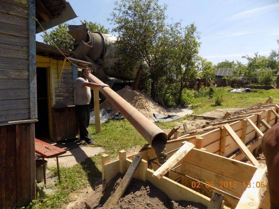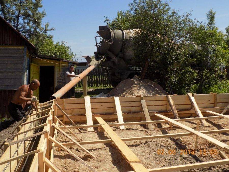 Здесь очень важно заливать бетон одномоментно, так как прочность фундамента залитого в несколько слоев значительно падает. Для этого в большинстве случаев заказывают бетонный раствор на заводе, который привозят в бетономешалке и заливают сразу по всему периметру