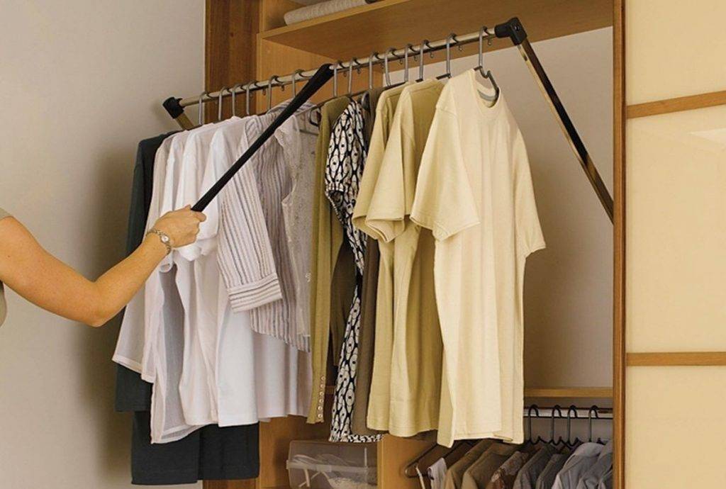 Это основа гардеробной комнаты. Организовывается в том отделе, где планируется размещение длинных вещей, таких как пальто. Для этого нужна штанга, которая размещается на высоте 1,65 м и более. Рубашки, пиджаки, блузки, то есть вещи более короткой дины, необходимо вешать на высоте до 1 м.
