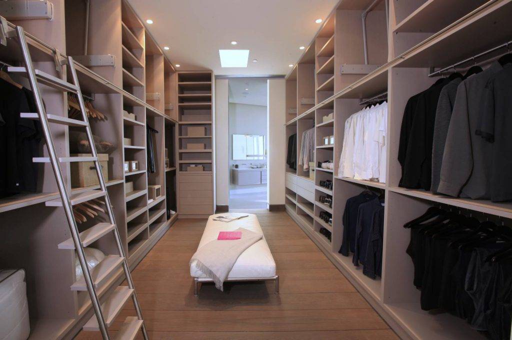 Такой вариант планировки подходит для помещений с большой площадью. Иногда под такие гардеробные отводят отдельную комнату. Поэтому такая гардеробная актуальна для больших квартир и частных домов.