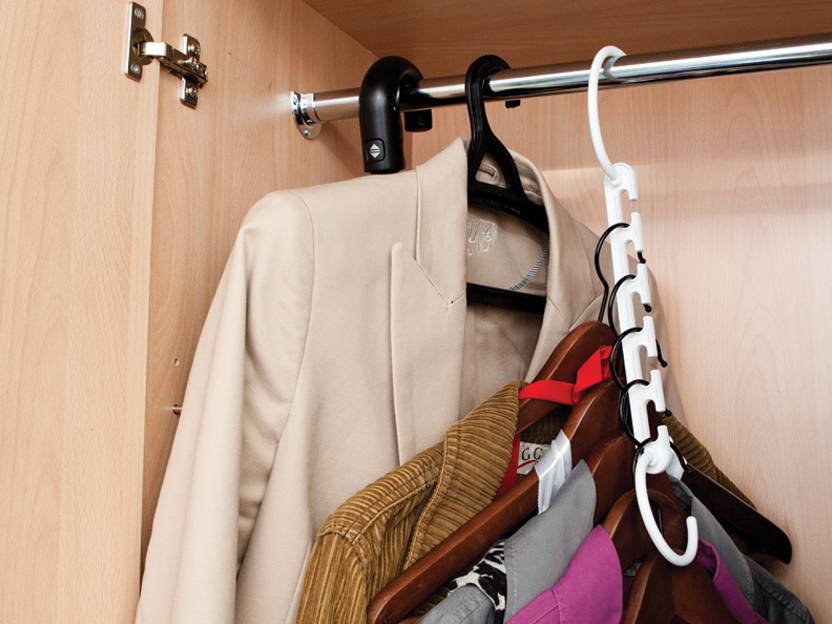 Вешалки также бывают разными по типу: выдвижные, круговые, подвесные. Круговые вешалки удобно разместить в углу, подвесные – на штангах. Для хранения ремней, галстуков, зонтов можно использовать обычные настенные крючки. Отличным вариантом являются гардеробные барьеры с крючками, позволяющие разместить на них большее количество вещей.