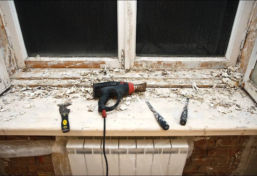 б) Второй способ годится для деревянного подоконника: с него можно отслаивать старую краску с помощью строительного фена. Это тоже процесс, нуждающийся в проветривании, так как масляная краска будет закипать и испускать неприятный запах.