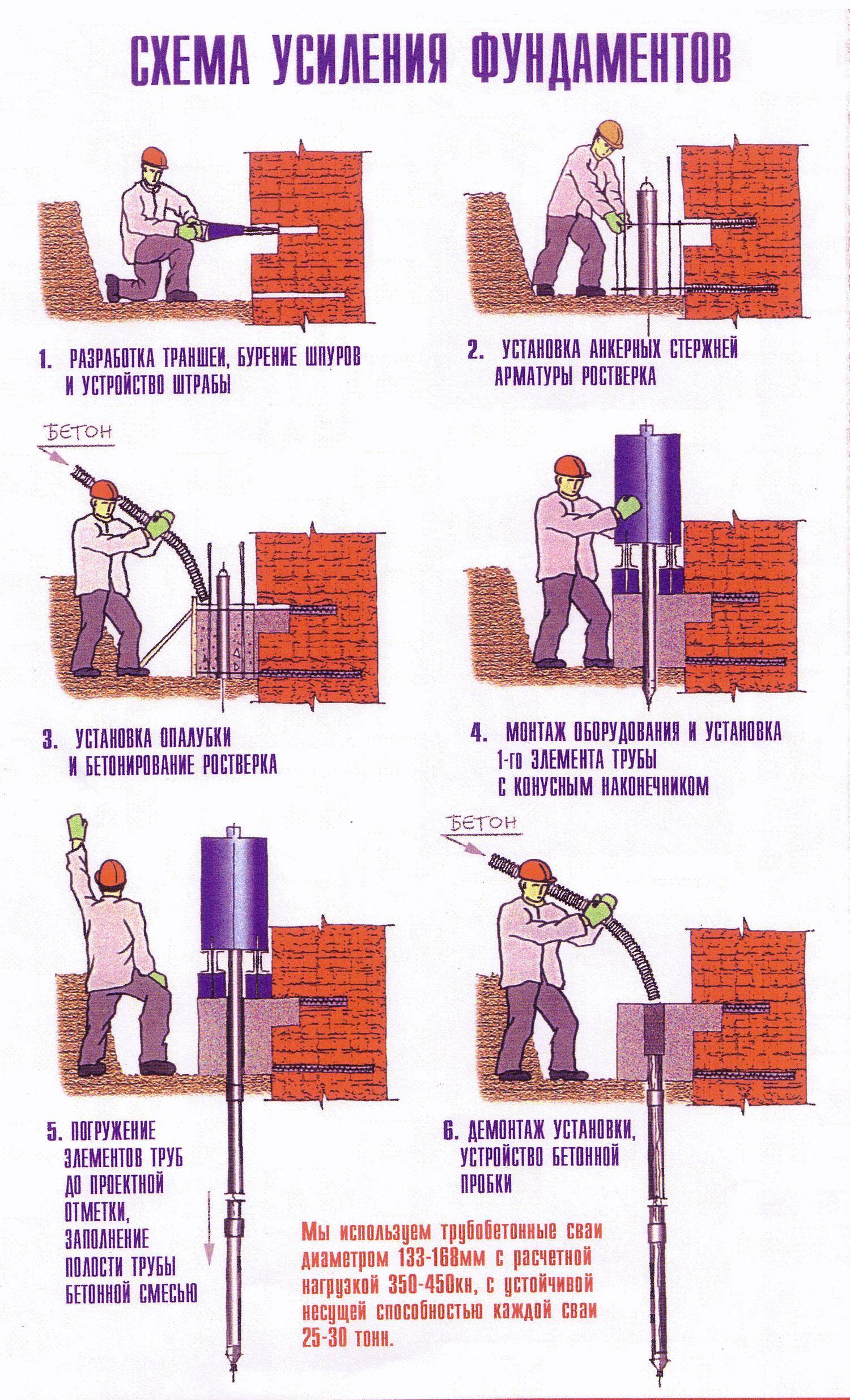 Существуют разные способы усиления всевозможных фундаментов. Например: