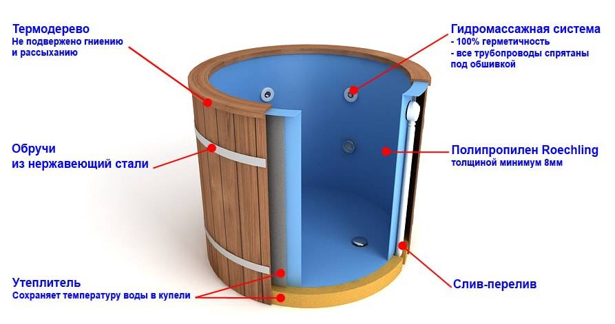 Купели для бани, предлагаемые современными производителями, дают возможность прекрасного и роскошного отдыха в течение всего года, особенно зимой, когда плавание в естественных водоемах маловероятно. Сегодня пользуются достаточной популярностью конструкции из полипропилена, которые отличаются высокой практичностью и долговечностью. Купель для бани — отличный способ провести день на свежем воздухе, так как помимо расслабления, времяпровождение в воде приносят пользу для здоровья, позволяя тело закалить. Чаще всего полипропилен имеет толщину стенок и дна 5 мм, синий цвет, отличается устойчивостью к ультрафиолетовым лучам. Вместимость может составлять от 4 до 10 человек, а размер — от 1,6 до 2,2 м в диаметре.