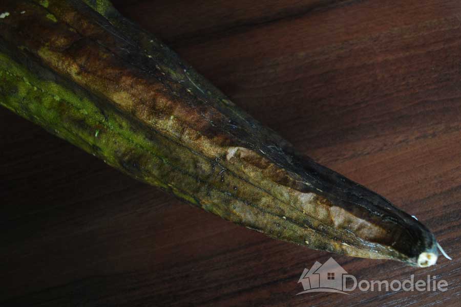 Высушенные плоды имеют желто-коричневый цвет и, в сравнении со спелыми зелеными плодами, значительно меньшую массу. Если потрясти такой плод, в нем как в маракасах будут стучать семена. Если плоды чуть не досушить, мочалка получается более мягкой. Однако сделать натуральную мочалку менее жесткой можно и другим способом (об этом чуть ниже).