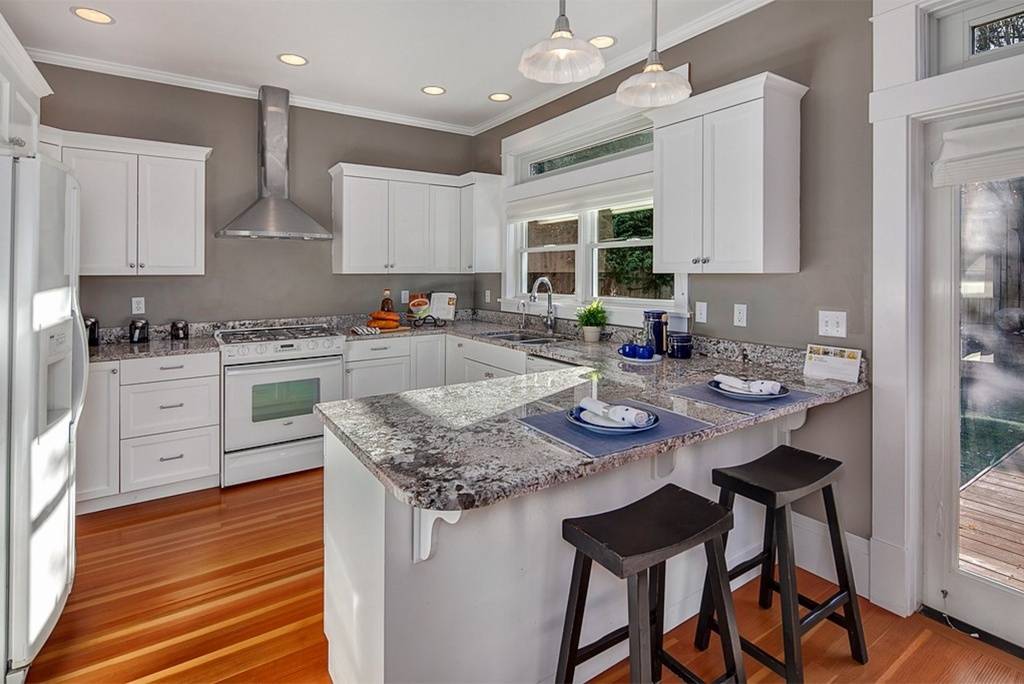 Если вы не знаете, как расположить кухонный гарнитур в комнате с двумя окнами, то угловая кухня с барной стойкой станет отличным решением. В этой планировке у глухой стены размещают основной гарнитур с навесными шкафчиками, плитой и мойкой, у окон – столешницу для работы. Барную стойку располагают напротив основного гарнитура, перпендикулярно столешнице у окна. Это отличный вариант и для студии, так как стойка позволяет визуально отделить зону кухни от гостиной.