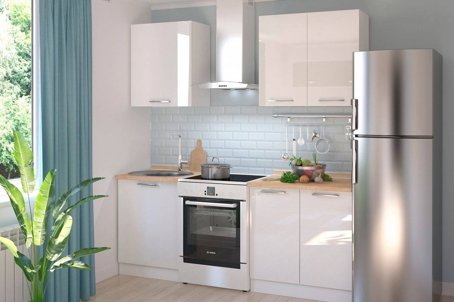Дизайнеры рекомендуют подбирать верхние шкафы в цвет потолка: этот прием увеличит высоту помещения.
