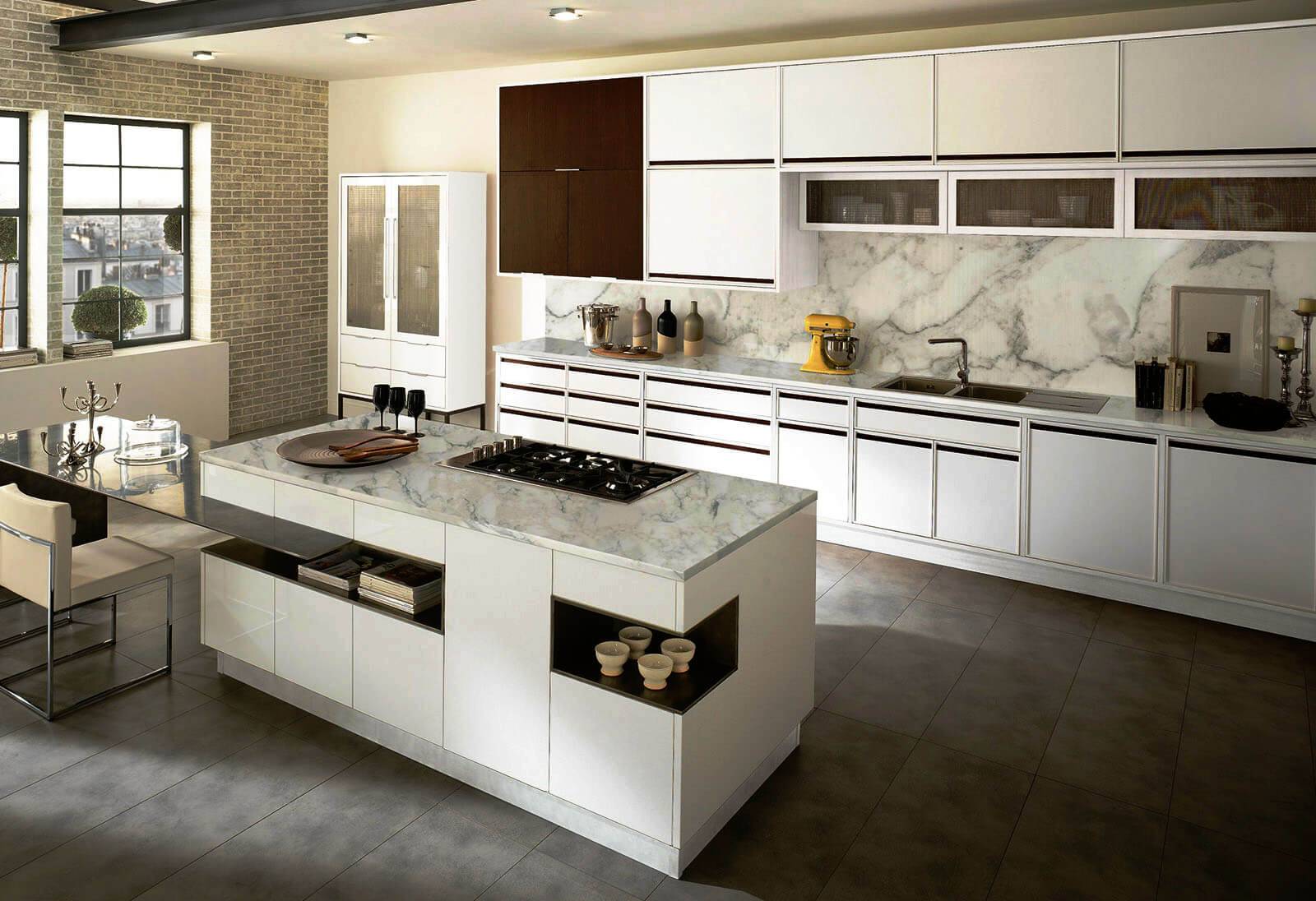 Остров – элемент гарнитура, который выносится в центр комнаты. В результате появляется дополнительная рабочая поверхность и система хранения. Кроме того, остров может играть роль обеденного стола, на котором удобно завтракать или перекусывать.