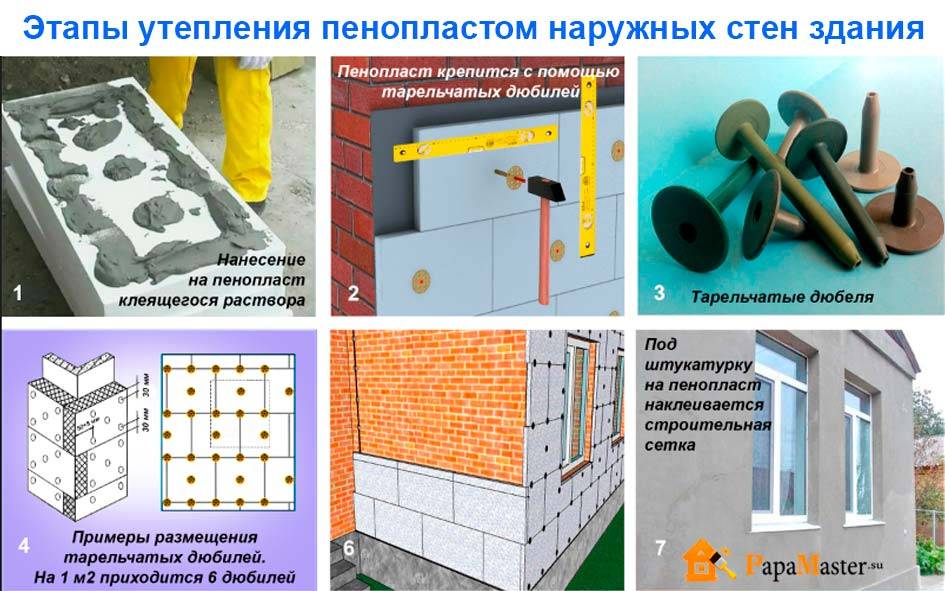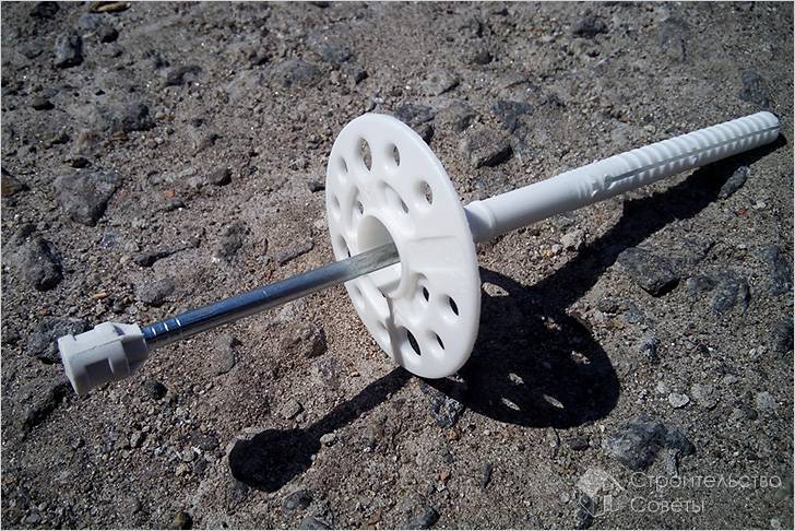 Спустя несколько дней, после того как клеевой состав просохнет, теплоизоляция нуждается в дополнительном укреплении при помощи распорных дюбелей. При этом учитывается длина дюбелей, которая зависит от толщины утеплителя, клеевого раствора и покрытия, бывшего раньше на фасаде.