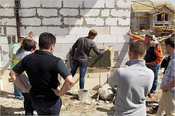 В процессе монтажа мокрого фасада строители пользуются разбежным методом укладки плит. Плиты нужно прижимать не только к поверхности стены, но и к соседним плиткам