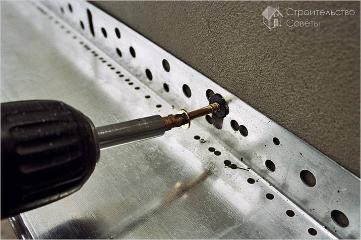 Дюбелями и саморезами осуществляют крепление профиля