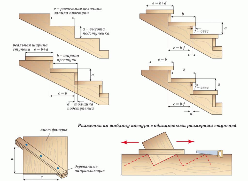 На приготовленных досках нужно отметить длину и отпилить лишнее. На бруске с помощью угольника размечают высоту подстепенка и ширину проступи с убавкой 2-4 см.