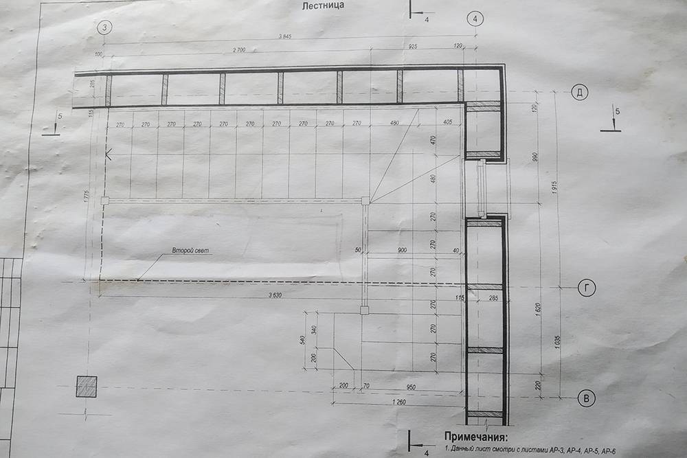 Проект Г-образной лестницы с забежными ступенями прилагался к архитектурной документации дома. На нижнюю часть лестницы отводилось примерно 2,7 м вдоль стены, на верхнюю — 3,5 м