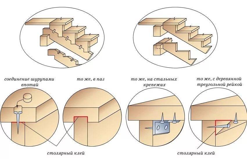 После фиксации подступенков устанавливаются заранее фрезерованные ступени, длина которых должна превышать расстояние между парой крайних косоуров на 1-2 см. Ширина элементов должна быть на 2-3 см больше гребеночного выступа. Крепление ступеней к подступенкам и косоурам осуществляется на саморезы, шляпки которых должны быть утоплены в дерево.
