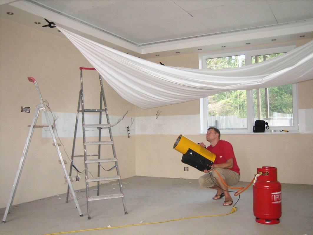 - Тканевое полотно заправить, перемещаясь от углов к центру, а пленочное полотно – от центра к углам помещения.